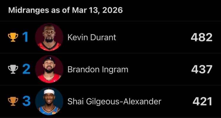 开云体育娱乐app安全-没有阿赞!本赛季中距离命中数前三:杜兰特、英格拉姆、亚历山大